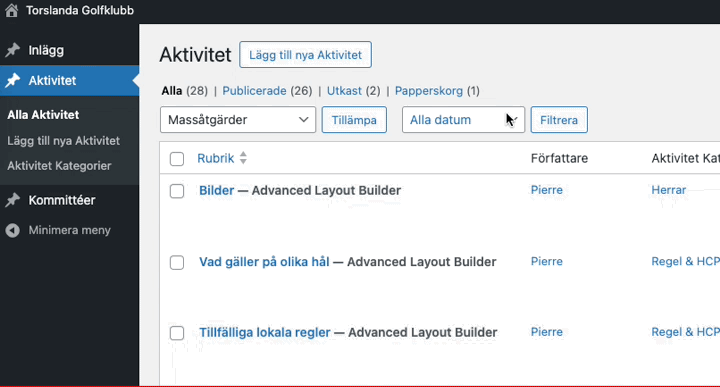 När en aktivitet har blivit duplicerad så finns den som en helt ny kopia av den aktivitet du duplicerade. Den har även fått statusen ”Utkast”, vilket betyder att den inte syns publikt för besökaren. Nu kan du redigera din nya kopia av sidan och byta namn, innehåll mm innan du väljer att publicera den.